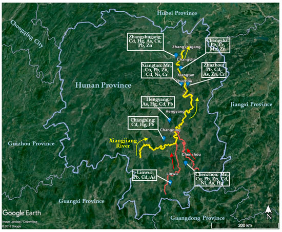 It is well known that there are abundant reserves of non-ferrous metals in Hunan Province, and most ores for mining, mineral processing, and smelting of non-ferrous and rare earth elements are located in the Xiangjiang Valley. The Xiangjiang River, which cuts across Hunan Province, is a main water resource for drinking water, process water, and the irrigation of crops. Because of prolonged mining and smelting activities for non-ferrous metals, wastewater has been discharged to the surrounding environment and the Xiangjiang Valley is the most infamous polluted area in central China [25]. Water, soils, and crops in Xiangjiang River basin are heavily contaminated by Cd, Hg, Pb, as well as As [26,27]. The “12th Five-Year” Plan for Comprehensive Prevention and Control of Heavy Metal Pollution indicates that the five major PTE pollutants in China are identified as Pb, Hg, Cd, Cr, and As [28]. In 2015, the state statistics for “the discharge of major pollutants in regional wastewater”, Hg, Cd, and As in Hunan province account for 20.3%, 37.9%, and 32.6% of the total emissions, respectively [29]. The “11th Five-Year Plan” Xiangjiang River basin water pollution prevention and control plan of Hunan province reported that the pollution in Xiangjiang is predominantly caused by Hg, Cd, Pb, As, Zn, and others [30]. The monitoring data for the main pollution indicators in the Xiangjiang are shown in Table 1 with Figure 1 summarizing the geographical distribution of these sources/effects.