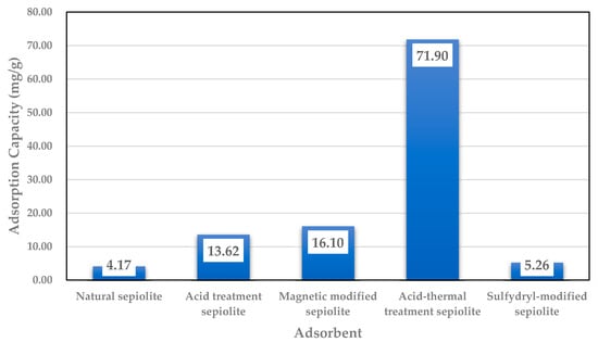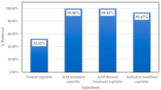 There are few studies on the removal of mercury ions using sepiolite and modified sepiolite. Those that are available show that modified sepiolite has a significantly improved effect on Hg2+ removal. As shown in Figure 2, the removal of Hg2+ was more than 90% after acid modification, acid thermal modification, and organic modification, compared with the natural sepiolite (about 50%).