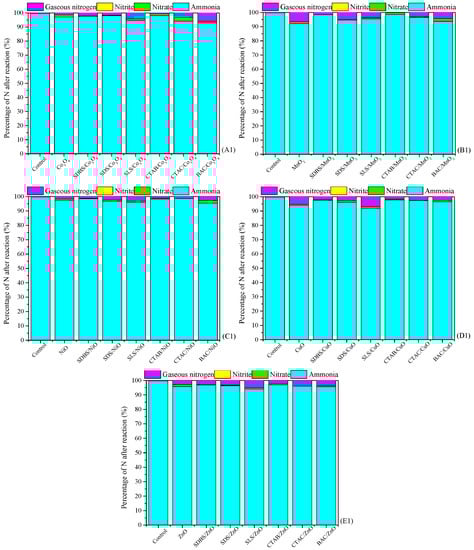 Conversion performance of the metal oxides and surfactant-enhanced metal oxides used for treatment of NH4+ in water. Catalyst preparation conditions: molar ratio of melt salt, NaOH and surfactant 1:2.1:0.093, calcined at 400 °C for 4 h; Reaction conditions: [NH4+], 50 mg/L from NH4Cl; initial pH of the solution, 9; dosage of catalyst, 1 g/L; magnetic stirring speed, 600 r/min; reaction temperature, 20 °C; and reaction time, 120 min. (A1) Conversion performance of control, Co3O4 and surfactant-enhanced Co3O4 catalysts used for treatment of NH4+ in water, (B1) Conversion performance of control, MnO2 and surfactant-enhanced MnO2 catalysts used for treatment of NH4+ in water, (C1) Conversion performance of control, NiO and surfactant-enhanced NiO catalysts used for treatment of NH4+ in water, (D1) Conversion performance of control, CuO and surfactant-enhanced CuO catalysts used for treatment of NH4+ in water, (E1) Conversion performance of control, ZnO and surfactant-enhanced ZnO catalysts used for treatment of NH4+ in water.