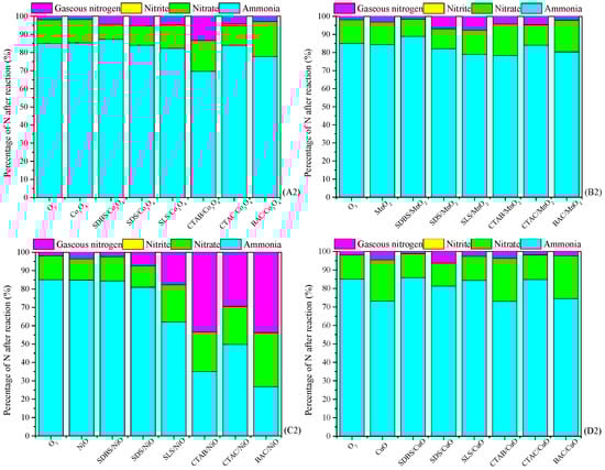 As a comparison, catalytic performance of metal oxides and surfactant-enhanced metal oxides used for ozonation of NH4+ in water is shown in Figure 2. In the case of ozone without catalyst, the removal rate of NH4+ was about 15% and most of the removed NH4+ was converted to NO3– (13%), which is more hazardous than NH4+. In the case of metal oxide catalysts without ozone, their catalytic performance is almost negligible. As for anionic surfactant-enhanced metal oxide catalysts, SDS/ZnO can greatly reduce the NH4+ content in the solution, but it produced a large amount of undesired species of NO3–. Among cationic surfactant-modified metal oxide catalysts, the ozonation of NH4+ catalyzed by BAC/NiO contributed to the lowest residual NH4+ (26.74%), but the highest NO3– (29.52%). There was no significant difference in the content of NO3– produced by the ozonation of NH4+ with CTAB/NiO and CTAC/NiO (respectively 21.46% and 20.77%), but the residual NH4+ content was lower than the latter, respectively 35.06% and 49.78%. Based on the high removal rate of NH4+ and the low conversion of NO3–, it can be concluded that CTAB/NiO is the catalyst with the best catalytic performance.