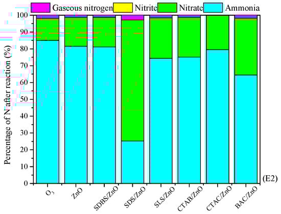 The conversion of NH4+ in the absence and presence of the metal oxides or surfactant-enhanced metal oxide without ozone is shown in Figure 1. In the control, NH4+ in solution did not decompose at all. In the presence of a catalyst, there was only a small amount of NH4+ that was absorbed and the removal rate was under 7%, indicating that the decomposition of NH4+ is not mainly due to the adsorption of NH4+ by the catalyst.