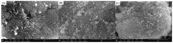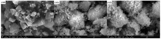 The surface components of solid catalysts were usually complicated and unevenly distributed. The surface structure that participated in catalytic reaction had many active sites with a special physical structure. Figure 3 shows SEM micrographs of the different types of catalysts. Figure 3A0 reveals Co3O4 in the form of flakes and small pieces, while the Co3O4 after the addition of the surfactant is irregularly bulky and has a large number of small particles on the surface, as shown in Figure 3A1–A6. MnO2 shown in Figure 3B0 is a pebble-like block with a superficially thick surface. Figure 3B1 indicates that the surface of bulk MnO2 particle becomes flat and smooth with the addition of SDBS. From Figure 3B2–B6, the morphology of SDS/MnO2, SLS/MnO2, CTAB/MnO2, CTAC/MnO2, and BAC/MnO2 has no significant difference from that of MnO2. Figure 3C0 shows the surface of NiO has a large amount of homogeneous and small particles, while Figure 3C1 with SDBS/NiO becomes smooth. The morphology of SDS/NiO, SLS/NiO, CTAB/NiO, CTAC/NiO, and BAC/NiO (Figure 3C2–C6) has no remarkable difference from that of NiO. Figure 3D0 reveals that the surface of CuO has distributed with a large amount of irregular and small particles. While the surface of surfactant-modified CuO has not distribute densely with particles. The surface of ZnO has large amount of small and compact blocky particles as shown in Figure 3E0. Figure 3E1,E6 display that the surface of SDBS/ZnO and BAC/ZnO samples has some sparse spherical particles, while that of SDS/ZnO, SLS/ZnO, CTAB/ZnO, and CTAC/ZnO has no significantly sparse spherical particles, as shown in Figure 3E2–E5.