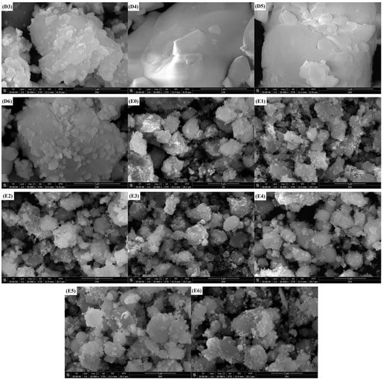 Scanning electron microscopy (SEM) images of catalysts. (A0) Co3O4, (A1) SDBS/Co3O4, (A2) SDS/Co3O4, (A3) SLS/Co3O4, (A4) CTAB/Co3O4, (A5) CTAC/Co3O4, (A6) BAC/Co3O4; (B0) MnO2, (B1) SDBS/MnO2, (B2) SDS/MnO2, (B3) SLS/MnO2, (B4) CTAB/MnO2, (B5) CTAC/MnO2, (B6) BAC/MnO2; (C0) NiO, (C1) SDBS/NiO, (C2) SDS/NiO, (C3) SLS/NiO, (C4) CTAB/NiO, (C5) CTAC/NiO, (C6) BAC/NiO; (D0) CuO, (D1) SDBS/CuO, (D2) SDS/CuO, (D3) SLS/CuO, (D4) CTAB/CuO, (D5) CTAC/CuO, (D6) BAC/CuO; (E0) ZnO, (E1) SDBS/ZnO, (E2) SDS/ZnO, (E3) SLS/ZnO, (E4) CTAB/ZnO, (E5) CTAC/ZnO, (E6) BAC/ZnO.