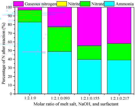 The amount of added surfactant may affect the surface chemical properties of the catalyst during the preparation process. On the other hand, it may influence on the physical structure characteristics and the activity of the catalyst. From Figure 4, it can be seen that the residual NH4+ in the solution decreased with increasing content of surfactant in the catalyst, while the percentage of gaseous nitrogen increased. With molar ratio of melt salt, NaOH and surfactant 1:2.1:0 to 1:2.1:0.093, the existing CTAB was not efficient to let O3 adsorb on the catalyst surface and decomposed to produce oxide species such as OH and O, thereby further degrading the NH4+ to reach the best result. When the molar ratio increased to 1:2.1:0.155, the content of gaseous nitrogen selectivity was the highest, which was 44.44%, with a NH4+ removal rate of 60.23%.