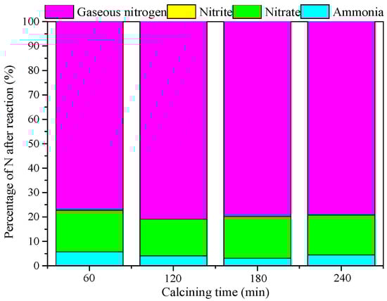 Figure 6 shows that the NH4+ removal was 95.93% and gaseous nitrogen selectivity was 80.98% when the calcination time was 120 min. However, the NO3− content increased with continuous increasing time in the calcination. The particles tended to agglomerate possibly due to sintering of the catalyst after being calcined for too long, which led to the active sites on the catalyst surface reduce.