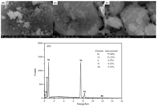 SEM images of catalysts. (A) CTAB/NiO-1, (B) CTAB/NiO-2, (C) CTAB/NiO-3, (D) CTAB/NiO-4, (E) CTAB/NiO-5, (F) CTAB/NiO-6, (G) EDS images of CTAB/NiO-2 (inset: mass percentages of Ni, O, C, N and Br).