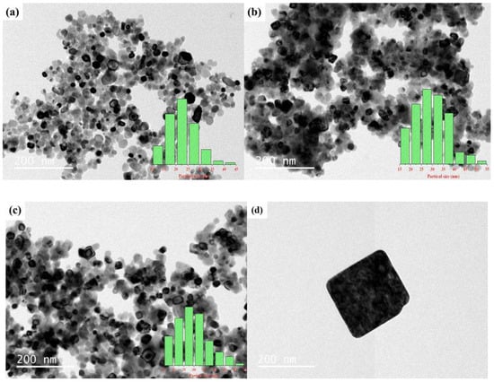 Transmission electron microscopy (TEM) images of catalysts: (a) CTAB/NiO-1, (b) CTAB/NiO-2, (c) CTAB/NiO-3, (d) CTAB/NiO-2.