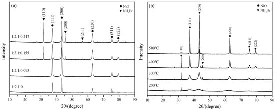 Figure 9 shows the X-ray diffractometer (XRD) patterns of the CTAB/NiO catalysts with different molar ratios, calcined at different temperatures for 4 h. From the XRD pattern, diffraction peaks can be indexed as NiO (JCPDS 47–1049) and NH4Br (JCPDS 73–1493). From Figure 9a it can be seen that no NH4Br was detected at the molar ratio 1:2.1:0.155. The potential reason is that the NH4Br formed under this condition is less and dispersed in the catalyst. While the peak height of NH4Br increased by the increasing of the amount of CTAB in the catalyst. On the other hand, Figure 9b indicates that the thermal treatment has a significant effect on the catalyst. The peak of NiO becomes sharper and narrower with the increasing of the calcination temperature, illustrating the crystallinity of NiO particles was enhanced and the purity was higher. When the temperature was increased from 200 °C to 400 °C, the peak intensity of the NH4Br component in the catalyst strengthened gradually. When the temperature was to 500 °C, the peak of NH4Br disappeared. It may be due to the fact that CTAB decomposes gradually to produce NH4Br as calcination temperature increasing, and its peak disappears because of the excessive temperature leading to thermal decomposition of NH4Br. Leverage the experimental results from the Section 3.2.1 and Section 3.2.2, the active component of NH4Br in the catalyst may play an important role in catalytic ozonation ammonia nitrogen in water.