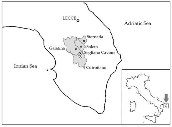 Salento is a geographical region located in the southern part of Apulia (south-eastern Italy) including the provinces of Taranto, Brindisi and Lecce. Although the Province of Lecce is characterized by low industrial activity, the mortality rates for lung cancer were found to be significantly higher than regional and national rates [28]. In particular, a geographical cluster including sixteen municipalities with a high incidence of lung cancer (355 confirmed cases vs. 285 expected in the period 2003–2006) and other respiratory diseases in the male population has been recently identified [29].