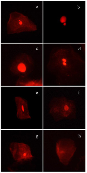 Cells were scored using both bright-field and fluorescence microscopy (Eclipse 50i, Nikon, Tokyo, Japan) according to Thomas and Fenech [14]. Cell types characterized by anomalies associated with cell death and nuclear abnormalities indicative of chromosomal instability or DNA damage were classified according to Bolognesi et al. [38]. Micronucleated cells (MNC) and nuclear buds (NBUD) as well as basal cells (BC), binucleated cells (BNC), condensed chromatin cells (CCC), karyorrhectic (KHC), pyknotic (PYK) and karyolytic (KYL) (Figure 2) were scored and their frequency was reported as number of classified cells in 1000 differentiated cells (‰).