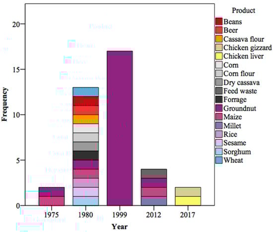 Since 1999, the focus of AFB1 research shifted from studies on hepatic carcinoma to agricultural concerns. This was due to international trade restrictions, especially regarding groundnuts [,]. A study by van Wyk, et al. [] pioneers this direction. According to them, it all started when European countries started to block the entrance of AFB1 contaminated groundnuts from South African companies supplied by farmers from Nampula province in Mozambique. When they investigated products, they found AFB1 levels extremely high.