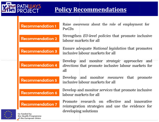 We hope that this special issue will promote a greater awareness worldwide of the barriers to the implementation of effective interventions, in particular for smaller enterprises and public agencies with less resources and knowledge to manage the issues that people with NCDs face in the work sector. PATHWAYS’ results stress the importance to adapt the workplace and the environment according to the needs of persons facing chronic health conditions and to enable these persons to maintain a job or return to work in the long run. In light of an aging working population and an increase of chronic health conditions in European countries, this will be one of the most important tasks that employers and politicians will have to take into account during the next decades. The PATHWAYS project provides first-hand evidence for recommending strategies of integration and reintegration at work for persons with chronic health conditions in European countries, and is based on solid methodology that also includes an extensive evaluation of national and European stakeholders’ perspectives and needs [1]. PATHWAYS Policy Recommendations for the employment of people with NCDs (Figure 2) have been developed to support both people with NCDs, who have to be recognized as a population who needs accessible and inclusive pathways for improving and maintaining their own health and their jobs, as well as the employment sector, which needs to be a facilitator for all but also requires support in learning how to do this (PATHWAYS Policy recommendations are included in the Supplementary Material). These recommendations and the actions that operationalize them also provide the base for actions implemented in the Join Action CHRODIS Plus, in the Employment and chronic diseases work-package (http://chrodis.eu).