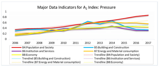 The pressure index (A2) refers to the direct human anger in response to the driving forces. It includes human engagement in different socioeconomic activities that consequently releases pressure resulting in waste generation. The corresponding indicators are shown in the B-layer (B4–B8), including building and construction (B4), population and society (B5), institutions and services (B6), energy and material consumption (B7), and the economy of the place (B8). The indicators are divided into 18 factors, C8–C25 under the C-layer with other subordinate factors in the D and E sub-layers (Figure 1, Appendix A).