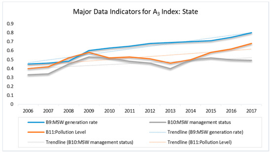The state index represents the actual environmental conditions in Dar es Salaam with respect to MSW. This index is subordinated by waste generation rate, collection (management) rate, and pollution level, denoted by B9, B10, and B11, respectively.