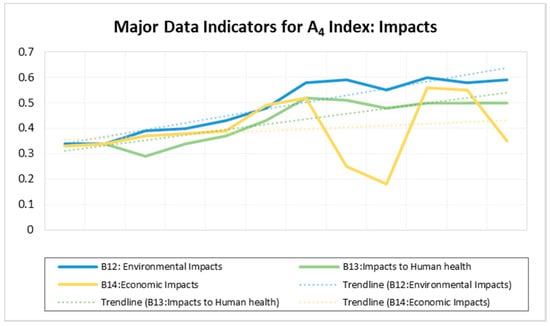 As indicated in Figure 4, the index value of the generation rate (B9) shows a continuously upward trend, particularly from 2008 to 2017. Substantial efforts were made to lower the high pollution level (B11). These efforts were reflected in the increasing amount of annual waste collection (B10), which resulted in a decrease in the index value, especially from 2010 to 2013 and from 2015 to 2017. However, these initiatives were not enough to suppress the existing pressure. The amount of uncollected and haphazardly dumped waste (C36) as well as the pollution level (B11) was high. The main reason for this failure was that, management status (B10) with all its variables (C33–37) were lagging far behind the rate of waste generation. For example, the maximum risk value for B11 (pollution level) reached 0.68 in 2017, which is under level IV [a relative high level (0.6–0.8)]. This signifies poor environmental quality, resulting from high external pressures that warrants serious measures to be taken before the extremely high level (level V), indicating a severe environmental damage, is reached.