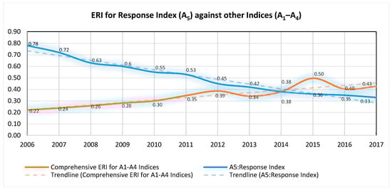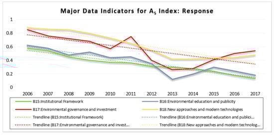 The pressure index, subordinated by indicators B4 through B8, was demonstrated to have the greatest influence on the overall ERI of Dar es Salaam MSW. All the indicators in this index were in a continuous upward trend from 2006 to 2017 (Figure 3). Building and construction (B5) fluctuated considerably, especially between 2010 and 2016. It was a key factor in the rapid increase in MSW in 2012, though was slightly less significant than population and society (B4), in 2013. Both were almost equally significant in 2014. From 2015 to 2017, there was a prominent decline in risk value from building and construction, until it was below all other indicators, except the institutions and services (B6). The primary information reveals that the underlying reason behind this trend was the remarkable shift in people’s priorities away from building and construction; they started giving more attention to basic needs, such as paying for food, electricity, water bills and other basic services since the beginning of the term of the current government. Likewise, all other indicators, except population and society (B4), increased approximately interdependently until mid-2015, when the decrease in the risk index became apparent. Despite this decrease, each indicator registered a continuously increasing trend.
