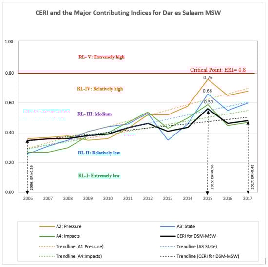 The ERI for Dar es Salaam MSW was found to be a function of different factors grouped into five major risk indices from the DPSIR model: the driving force, pressure, state, impacts, and response indices. These indices were subordinated using different indicators as subsets of a comprehensive ERI system, and were displayed as B- to E-layers (Figure 1 and descriptions in Appendix A). Each index affected the system in a different way and with a different magnitude, as presented in the following sub-sections.