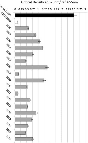 As shown in Figure 1, the reference strain ATCC 35,984 produces a great amount of biofilm, unlike the strain ATCC 12,228. Sixteen of the eighteen strains tested proved to be biofilm producers, in fact they produced biofilms equal to or smaller than the strain ATCC 35,984. We established an arbitrary index to indicate the rate of biofilm production, in relation to the optical density obtained in crystal violet assay. Therefore, the clinical isolates SE03, SE04, SE07, and SE09 showed a high-level of biofilm formation (biofilm index ≥ 1); SE01, SE02, SE05, SE10, SE12, SE13, SE14, SE15, SE16, and SE18 showed a moderate biofilm formation (biofilm index ≥ 0.5); SE06 and SE17 showed a low-level of biofilm formation (biofilm index < 0.5); and SE08 and SE11 showed a level overlapped to S. epidermidis ATCC 12,228 non-biofilm producer.