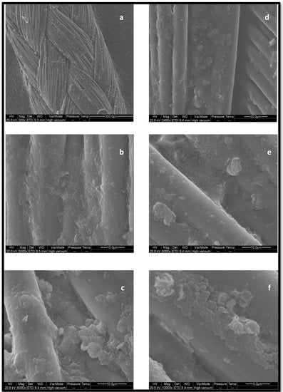 Gauge 2 suture thread (Coated, Braided Lactomer 9-1) colonized by S. epidermidis biofilm observed under SEM with increasing magnification (a,b Mag. 5000×; c–e Mag. 6000×; f Mag. 10,000×). The images evidence a well-developed microcolony, surrounded by regions of multilayered cells in the relatively flat biofilm.