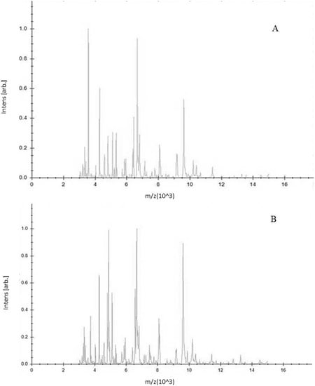 (A) Main Spectrum Profile of S. epidermidis ATCC 12,228 (non-biofilm producer); (B) main Spectrum Profile of S. epidermidis ATCC 35,984 (biofilm producer). They were obtained as a mean value of sixty mass spectra using MALDI Biotyper 3.0 software. The m/z ratio is shown on the axis of the abscissas, the intensity values is shown on the axis of the ordinates.