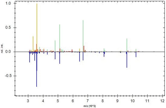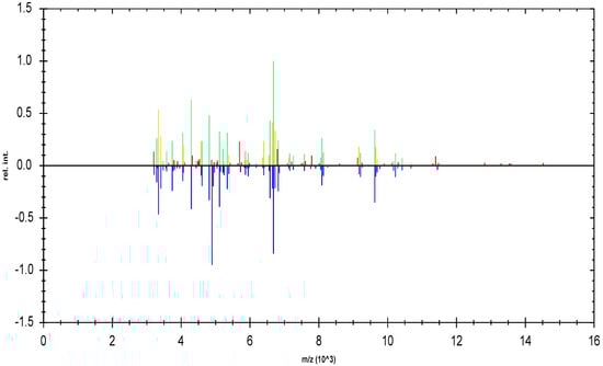 A Main Spectrum Profile is a reference spectrum consisting of a series of reference peaks corresponding to a single bacterial species. MSPs were created by analyzing 60 spectra obtained from samples subjected to the same growth conditions. Figure 3A,B show the two different mass spectra of strains of S. epidermidis ATCC 12,228 (non-biofilm producer) and ATCC 35,984 (biofilm producer), respectively. A customer database containing these two MSPs was created.