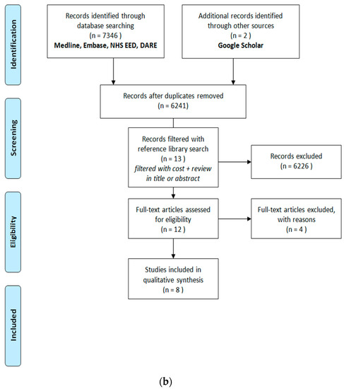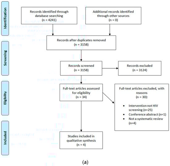 We retrieved 4241 articles on the effectiveness of HIV testing options. After the removal of duplicates, 3158 studies were screened by title and abstract for eligibility, based on our PICO criteria (see Table A1 in Appendix C). Of these, 34 studies were screened for full-text, and 30 studies were excluded at the full-text stage. The reasons for exclusion were that the intervention was not HIV testing (n = 25), conference abstract (n = 1), and not a systematic review (n = 4). Four systematic reviews were included in the end [,,,] (see Figure 1a). Additionally, 7346 economic studies were identified. After the removal of duplicates, we screened 6241 titles and abstracts for eligibility, and filtered the remaining records with “cost” and “review” in the title or abstract. Of the remaining 13 articles, 12 articles were selected for a full-text review. Eight studies were included [,,,,,,,] (see Figure 1b). Four studies were excluded, as a result of relevance to our PICO criteria.