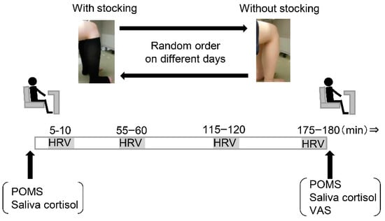 After 30 min resting period beginning upon arrival to the laboratory, in a supine position on a bed, participants were instrumented with standard lead II electrocardiogram to assess heart rate (HR) (Daily Care BioMedical, Chungli, Taiwan). Then, for the pre-sit measurements, the participants completed the POMS questionnaire, and their saliva was then collected for further analysis. Next, subjects were positioned in a comfortable chair for sit measurement, with or without graduated compression stockings, and HR was continuously measured for 5 min at around 10 min, 1 h, 2 h, and 3 h into the sitting period. The length of the stocking was from the top of the instep to the calf below the knee. The applied pressure of the graduated compression stockings was 29 hPa at the ankle and 20 hPa at the calf. Several widths of stockings were prepared and an appropriate garment was selected for each participant. Throughout the sitting protocol, participants’ feet were gently supported to avoid passive muscle contraction. Study personnel monitored participants during this time to ensure that no leg movement occurred, but participants were allowed to use their arms to read or use a laptop between HR measurements. After 3 h sitting, they completed the POMS questionnaire, their saliva was collected, and they completed the VAS scale for the assessment of uncomfortable feelings, including pain, fatigue, self-perceived sensation of swelling of the lower limbs, or whole body. The study protocol is shown in Figure 1.