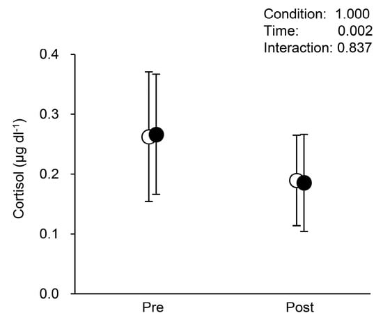Changes in saliva cortisol across conditions are shown in Figure 2. A significant main effect of the time was observed (F (1, 17) = 13.348, p = 0.002, effect size = 0.886, partial η2 = 0.440, 1 − β = 0.931), while no significant main effect of condition was observed (F (1, 17) = 0.000, p = 1.000, effect size = 0.000, partial η2 = 0.000, 1 − β = 0.050). There was no significant interaction (F (1, 17) = 0.044, p = 0.837, effect size = 0.051, partial η 2 = 0.003, 1 − β = 0.056). A 3 h sit significantly decreased saliva cortisol in both conditions, and the values were very similar.
