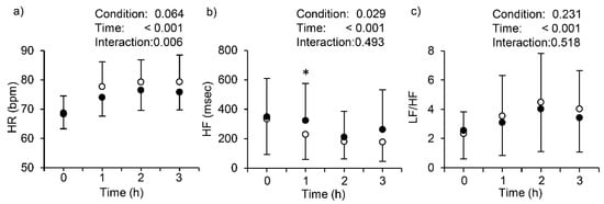 Changes in heart rate (HR; panel a) and HR variability (HF; panel b and LF/HF; panel c) with vs. without stockings. Values are mean ± SD. Each symbol means the same as in Figure 2. HR, heart rate; bpm, beats per minute; HF, high-frequency oscillations, LF/HF, the ratio of low- and high-frequency oscillations. The 0 on the X axis indicates the point between 5 and 10 min into a 3-h sit. * indicates a significant difference between with and without stockings at 1 h.