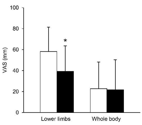 Comparisons in lower limbs and whole body VAS, with vs. without stockings. Values are mean ± SD. White bars indicate without stockings and black bars with stockings. VAS, visual analogue scale. * indicates significant difference between conditions in lower limbs VAS.