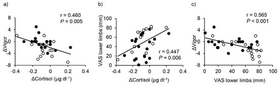 Pre-post changes in saliva cortisol were associated with changes in the V subscale of the POMS and lower limbs VAS when the data for both conditions were pooled (Figure 5, panels (a) and (b)). Additionally, changes in V were associated with lower limbs VAS (Figure 5c).