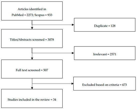 Our literature search identified 3206 articles (2273 from PubMed and 933 from Scopus). After removing duplicated articles (n = 128), each title and abstract for potential inclusion was screened. Studies involving participants aged ≥40 years and/or did not examine knowledge, attitude or practice regarding bone health/osteoporosis as the primary objective were excluded. Only original research articles written in English or Mandarin, with the main objective to study the knowledge, awareness, beliefs and practices among adolescents or young adults regarding bone health/osteoporosis, were included in this review. The full text of eligible articles was examined. Two reviewers decided articles to be included in the review. Any discrepancies between two reviewers were resolved by discussion. Data extraction on authors (year), subjects’ characteristics, study design, major findings were performed by the same authors. A total of 34 articles which met the criteria and provided sufficient information for data extraction and were included in this review (Figure 1).