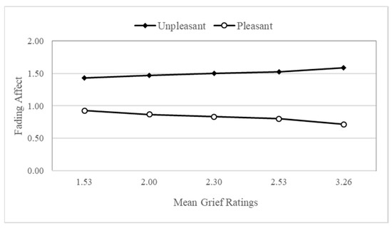 In contrast to the previous results, we used non-parametric statistics to analyze fading affect. The results from the Process Model 1 [55] revealed main effects for time, initial event affect, grief, negative religious coping, avoidant death attitudes, and accepting death attitudes. Moreover, Model 1 showed one significant two-way interaction between initial event affect and grief, B = 0.22 (SE = 0.09), t (665) = 2.34, p < 0.035, 95% CI (0.04, 0.40), ΔR2 = 0.007, such that the FAB increased along with grief. Figure 5 depicts this interaction, showing the fading affect for pleasant events and the fading affect for unpleasant events across each quintile of the grief measure scores. The direction of this relation was not expected. Table 2 includes the coefficients for the FAB across each of five quintiles for grief. As pleasant events were coded as 1 and unpleasant events were coded as 2, large, positive coefficients represent a strong FAB.