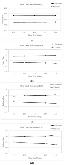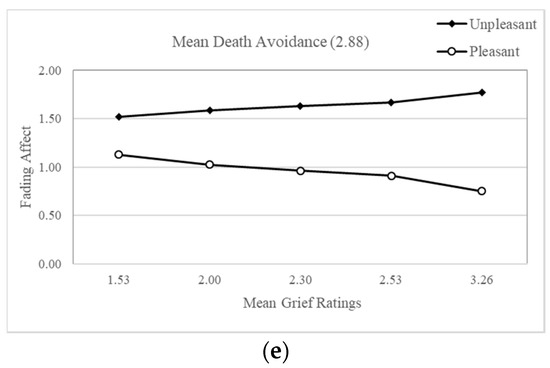 In summary, we found a robust FAB, such that affect faded more for unpleasant (death) events than for pleasant events, and unpleasant affect faded more for older events than for newer events. Most importantly, grief positively predicted the FAB, which is a positive/healthy emotional outcome. Although this relation was the opposite of the expected one, additional analyses and literature made sense of the effect. Death avoidant attitudes moderated this unexpected effect, such that the Initial Event Affect by Grief interaction was not significant at low levels of death avoidant attitudes, but the effect increased as the individual difference variable increased. The three-way interaction results indicate that moderate levels of grief and strong death avoidant attitudes may be resiliency mechanisms during bereavement, which is in line with the mobilization-minimization hypothesis [18]. Future research should examine if social rehearsals and mindfulness can reduce grief for individuals who report extremely low and high grief. Future research should also evaluate the moderating role of death attitudes for low to moderate grievers, and it should examine the moderating effects of emotional processing speed and emotional attachment. Furthermore, future research should assess fading affect for unpleasant and pleasant death events, and it should control for potential limitations. In conclusion, the results in the current study suggest that individuals can overcome the tragic death of a loved, like the death of a child depicted in the movie Collateral Beauty [89], but they must avoid thoughts of death and grieve, so they can activate the necessary cognitive resources to properly regulate the emotions produced by death.