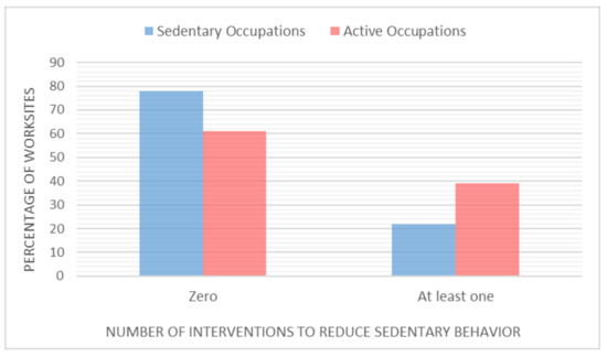 n = 1) reported all four interventions. Of the worksites offering interventions, sedentary occupations (61%) were more likely to offer at least one intervention than active worksites (39%),