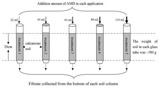 Fifteen glass columns (with a 25 cm length and 4.7 cm internal diameter) were uniformly packed to a depth of 20 cm with collected soil. The weight and density of the soil in each glass tube was ~380 g and ~1.042 g/cm3. Four layers of gauze were placed in the bottom of each soil column to prevent the loss of soil particles during the experiment. The pre-experiment results showed that this gauze application had no impact on the efficiency of the contaminant removal. Cu is one of the most important heavy metals in acid mine drainage in the Shanxi area. Therefore, the migration behavior of Cu from AMD in the calcareous soil was investigated in this study. Five treatments were conducted. The 22 mL (for treatment 1), 44 mL (for treatment 2), 66 mL (for treatment 3), 88 mL (for treatment 4), and 110 mL (for treatment 5) of the simulated AMD were added to the upper end of the soil columns during each application. The AMD properties that were applied to treatments 1 to 5 were consistent for the same application. All of the treatments were designed with three replicates. In fact, our team used the soil column (with a 20 cm effective length and 16 cm internal diameter) to carry out the related research pre-experiment with the addition of 0.25 L of stimulated AMD before carrying out this study. From the pre-experiment results, it was found that the AMD pollutants (such as Fe, SO42−, Cu) were mainly intercepted in the soil. Therefore, on the basis of the pre-experiment results, this study sought to further investigate the migration of AMD pollutants in the surface 0–20 cm soil. The parameter of 22 mL of stimulated AMD came from the relevant parameters in the pre-experiment. Based on the selected 22 mL, the 44 mL, 66 mL, 88 mL, and 110 mL in this study were set according to equal difference. A total of 20 batches of applications of AMD were added to each soil column over 132 days. A schematic diagram of the reaction columns is shown in Figure 1. All of the soil columns were sealed and stored at 4 °C during days 78–108 because of the winter vacation. After each application of AMD, the pH of the filtrate that was collected from the bottom of each soil column (if any) was measured. In addition, 1 mL of filtrate was passed through a 0.22-μm membrane filter and the total Fe and SO42− concentrations in the filtrate were analyzed.