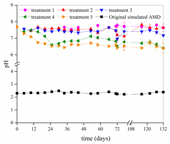 In general, the maximum water-holding capacity for the calcareous brown soil in the Shanxi province ranges from 20% to 30% [37]. In this study, the initial soil moisture content (11.64%) was below the soil’s maximum water-holding capacity. The filtrate volume that was collected from the calcareous soil column in treatment 1 (22 mL AMD per application) was <5 mL during the first 30 days because the soil moisture content during this time did not reach the soil’s maximum water-holding capacity. The pH value of the filtrate could not be determined in this volume condition. Furthermore, over 30 mL (the pH value, total Fe and the SO42− of the filtrate can be determined in this volume condition) of the filtrate could be collected from the bottom of the soil columns in treatment 2 on day 10 (3rd batch application, 44 mL AMD/application), from the columns in treatment 3 on day 5 (2nd batch application, 66 mL AMD/application), from the columns in treatment 4 on day 5 (2nd batch application, 88 mL AMD/application), and from the columns in treatment 5 on day 0 (1st batch application, 110 mL AMD/application).