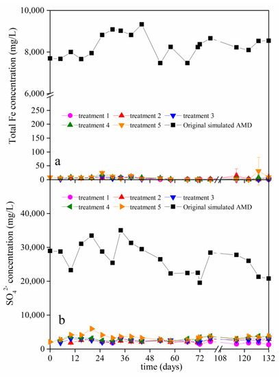 The concentrations of the (a) total Fe ions and (b) SO42− in the filtrate that was collected from the bottom of the soil columns in the different treatments. (Treatments 1, 2, 3, 4, and 5 represent the addition of 22, 44, 66, 88, and 110 mL, respectively, of simulated acid mine drainage (AMD) that was added to the soil columns at each application).