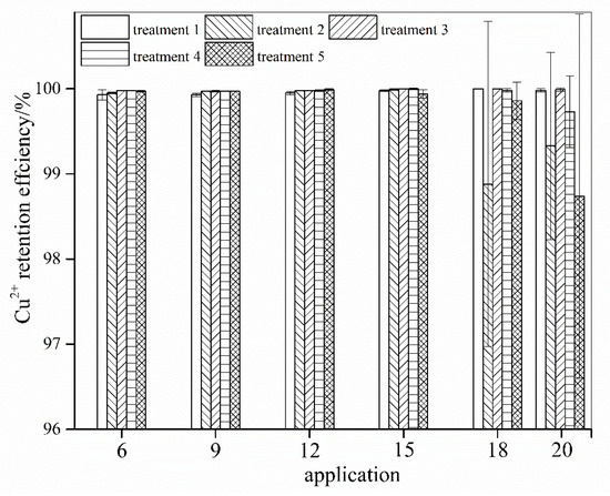 AMD is characterized by a low pH, high concentrations of SO42− ions and total Fe, and various concentrations of different metals such as Cu, Al, and Ni. The retention efficiency of calcareous soil for heavy metals was investigated using Cu as the representative pollutant. The Cu retention efficiency in the different treatments at applications 6, 9, 12, 15, 18, and 20 are shown in Figure 4.