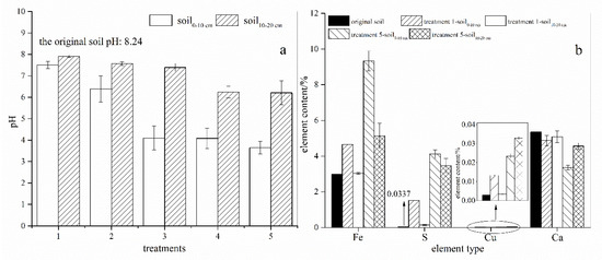 (a) The pH, (b) Fe, S, Cu, and Ca distributed in the calcareous soil (0–10 cm and 10–20 cm depths) that was contaminated by simulated acid mine drainage (AMD). (Treatments 1 and 5 represent the addition of 22 and 110 mL, respectively, of simulated AMD to the soil columns at each application).