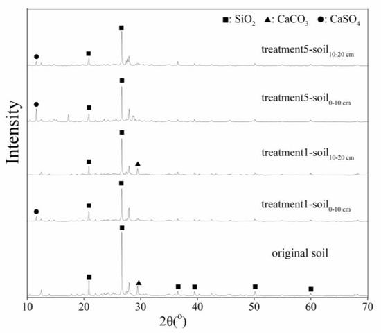 The mineral phase of inorganic soil particles can be explored using XRD technology [44]. In this study, the XRD patterns of the original soil and the AMD-polluted soil were examined. The soil0–10cm and soil10–20cm samples from treatments 1 and 5 were used as examples and are shown in Figure 6. According to the Joint Committee on Power Diffraction Standards data files [45] cards No. 46-1045 and 47-1743, the patterns in Figure 6 indicate that the dominant substances in the original soil were SiO2 (characteristic peak in XRD patterns at 2θ = 26.64° and 20.86°) and CaCO3 (calcite, characteristic peak in XRD patterns at 2θ = 29.40°).