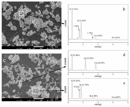 Scanning electron microscopy (SEM) images and energy dispersive X-ray spectroscopy (EDS) spectra of the calcareous soil before and after the addition of simulated acid mine drainage (AMD). (a) SEM of the original soil; (b) EDS of the particle marked with a square in 7 (a); (c) SEM of soil0–10cm in treatment 5 (110 mL AMD/application); (d) EDS of the particle marked with a narrow rectangle in 7 (c); (e) EDS of the particle marked with a square in 7 (c).