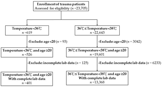 After receiving approval from the institutional review board of the Chang Gung Memorial Hospital (number 201700012B0), a retrospective review of the Trauma Registry System at a level I trauma center of the Kaohsiung Chang Gung Memorial Hospital [18,19] was performed to identify all adult trauma patients admitted via the ED from 1 January 2009 to 12 December 2015. The inclusion criteria consisted of patients aged at least 20 years and hospitalized for all trauma causes. The exclusion criteria included patients with missing information, such as vital signs or Glasgow Coma Scale (GCS) score; those who were dead on arrival; those who died in the ED; or those who were discharged from the ED. Patients with hyperthermia were not included. Based on their temperature upon arrival to the ED, the study population was finally divided to those displaying hypothermia (body temperatures of <36 °C) and those with normothermia (body temperatures between 36 °C and 38 °C) groups.