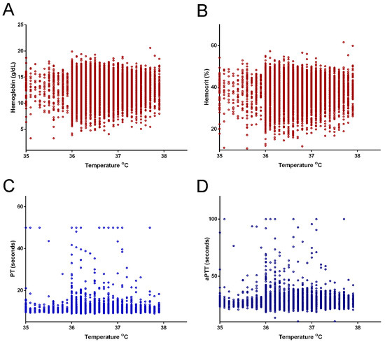 Pearson correlation of levels of hemoglobin (Hb) (A), hematocrit (Hct) (B), prothrombin time (PT) (C), and activated partial thromboplastin time (aPTT) (D) to the body temperature.