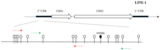 Schematic representation of location of the CCGG loci in the 5UTR of LINE-1.