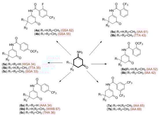 The synthesis of the 5-methyl and 5,5-dimethyl fluorinated N-benzamide enaminone analogs were done using a one-pot base-catalyzed acylation reaction (Figure 2) []. The synthetic procedure involved amination of the respective β-diketones to generate the methylated enaminone intermediates, followed by acylation with the respective substituted acyl chloride to provide target compounds 4a–9b, (Figure 3) [,,]. We obtained all of the final compounds in moderate to good yields (14%–63%), as shown in Table 1.