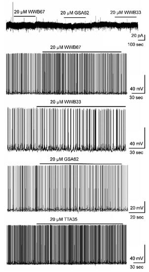 To expand our drug discovery efforts, we tested the five novel enaminones that were screened in the ETSP rodent seizure models (GSA 62 (4a), TTA 35 (5b), SGA 33 (5c), WWB 67 (6b) and THA 36 (6c)). We hypothesized that one or more of the five novel enaminones has a reversible inhibitory effect on mitral cells, similar to the drug effect of KRS−5ME−4−OCF that resulted in a decrease of the firing rate and a more negative membrane potential []. Bath application of none of the novel enaminones modulated the action potential firing rate of mitral cells or changed the membrane potential in either a depolarizing or hyperpolarizing direction (Figure 4). Likewise, the enaminones did not evoke a distinct membrane current in our recording conditions. Compared to control conditions, the recorded cells did not show measurable responses to any of the five novel enaminones (p > 0.05, n = 5).