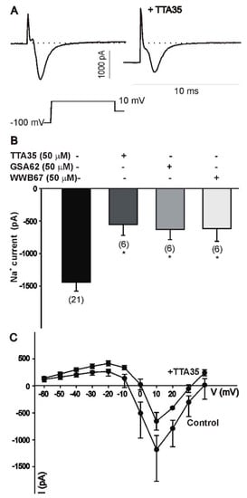 Inhibition of voltage-gated sodium channel currents. Effect of TTA 35, GSA 62, or WWB 67 on whole-cell sodium currents in ND7/23 cells. (A) Typical whole-cell sodium current generated in an ND7/23 cell before and after treatment with 50 µM of TTA 35. Sodium current was generated by a voltage step to +10 mV from a holding potential of −100 mV. (B) Treatment of ND7/23 cells with 50 µM of TTA 35, GSA 62, or WWB 67 evoked a significant reduction in the amplitude of the sodium currents generated by a voltage step to +10 mV. The number of recorded cells under each condition is presented in parenthesis. * represents p ≤ 0.05 vs. vehicle. (C) TTA 35 treatment does not alter the current–voltage relationship, as indicated by the presence of the peak current at +10 mV.