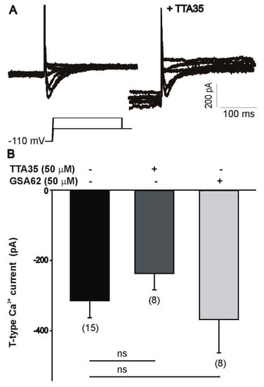 Inhibition of voltage-gated calcium channel currents. Effect of TTA 35 or GSA 62 on T-type calcium currents in ND7/23 cells. (A) Typical T-type calcium currents generated in an ND7/23 cell before and after treatment with 50 μM of TTA 35. T-type calcium currents were generated by a voltage step up to −20 mV from a holding potential of −110 mV. (B) Treatment of ND7/23 cells with 50 μM of TTA 35 or GSA 62 did not alter the amplitude of the T-type calcium currents generated by a voltage step to −20 mV. NS represents no statistically significant difference vs. vehicle.