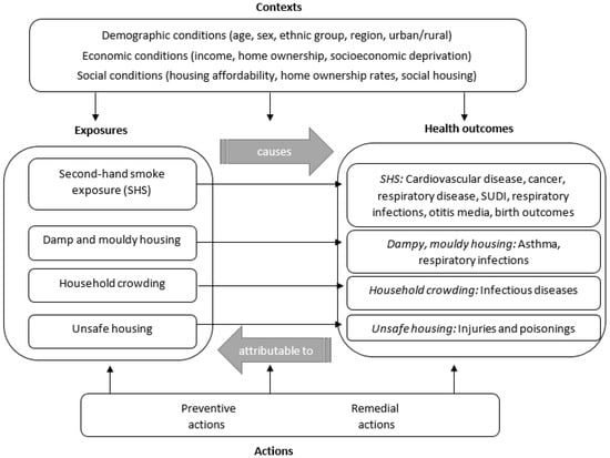 | Damp, mouldy, cold houses | Damp and mould | Children living in damp and mouldy houses | Asthma exacerbation | Respiratory infections, bronchitis |
